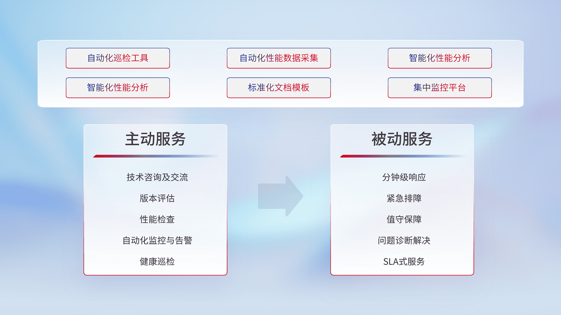 智能化工具和标准化文档,,,,保障服务质量,,,,提供主动服务(包含技术咨询、、、版本评估、、、性能检查、、自动化监控与告警、、、健康巡检)和被动服务包含(分钟级响应、、、、紧急排障、、、值守保障、、问题诊断解决、、、SLA服务)。。
